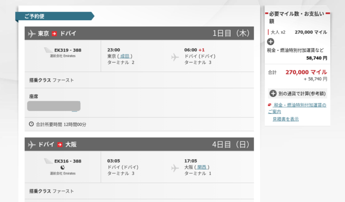 今回私は、270,000マイル を使用して、2人分 の ファーストクラス航空券  を手に入れました(日本=ドバイ往復)。