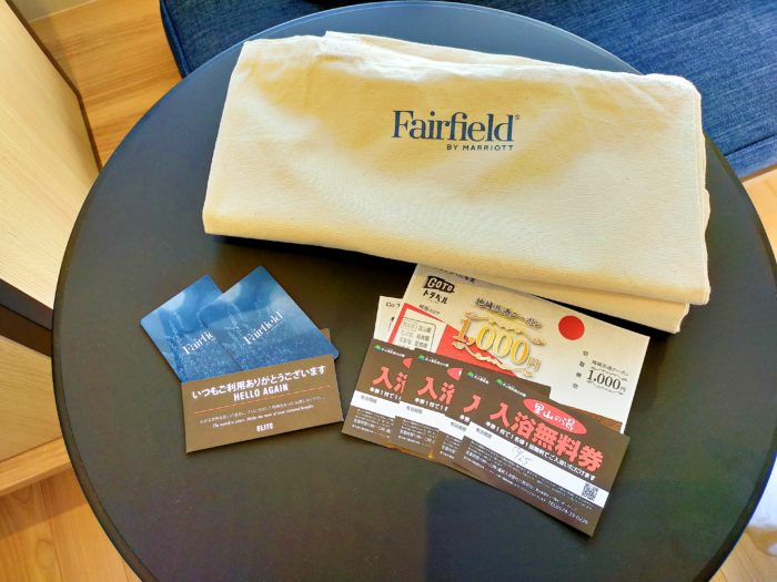 チェックイン時にいただいたルームキー、オープン記念のエコバッグ、GoToトラベルのクーポン、里山の湯入浴無料券です。