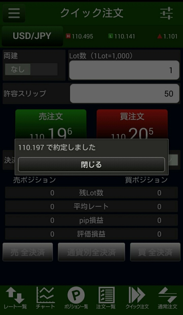 注文画面は「通常注文」と「クイック注文」の2種類があるのですが、損失をなるべく少なくするためにスキャルピングという手法を使いますので、クイック注文画面で取引をしました。