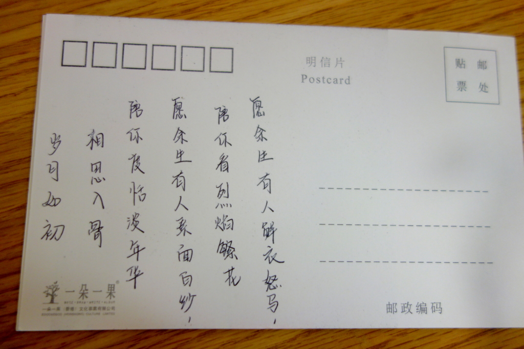 しかし、「何か書いて!」とお願いしても『紙なんて何も無いわよー』と言われかねないので、自分でポストカードを買い込んでおいたのです。そう、北京観光の時にポストカードを買っておいたのです。