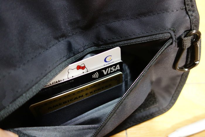 セキュリポの中に小さなポケットが3つ付いており、クレジットカードが3枚入ります。