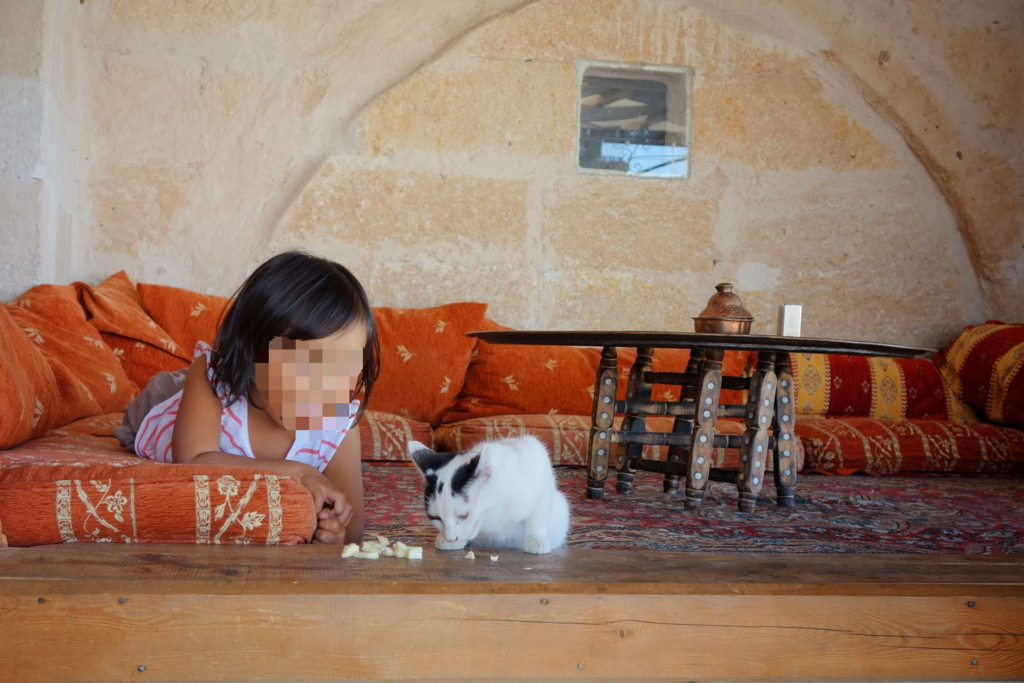 ホテルではネコにチーズをあげたり。この旅で、「あ、この子は鳥やネコがいればどこの国でも楽しめる」と思いました。実際その後の旅でも、ハトを追いかけてキャッキャッ言って楽しんでいることがよくあります。Kelebek Special Cave Hotel